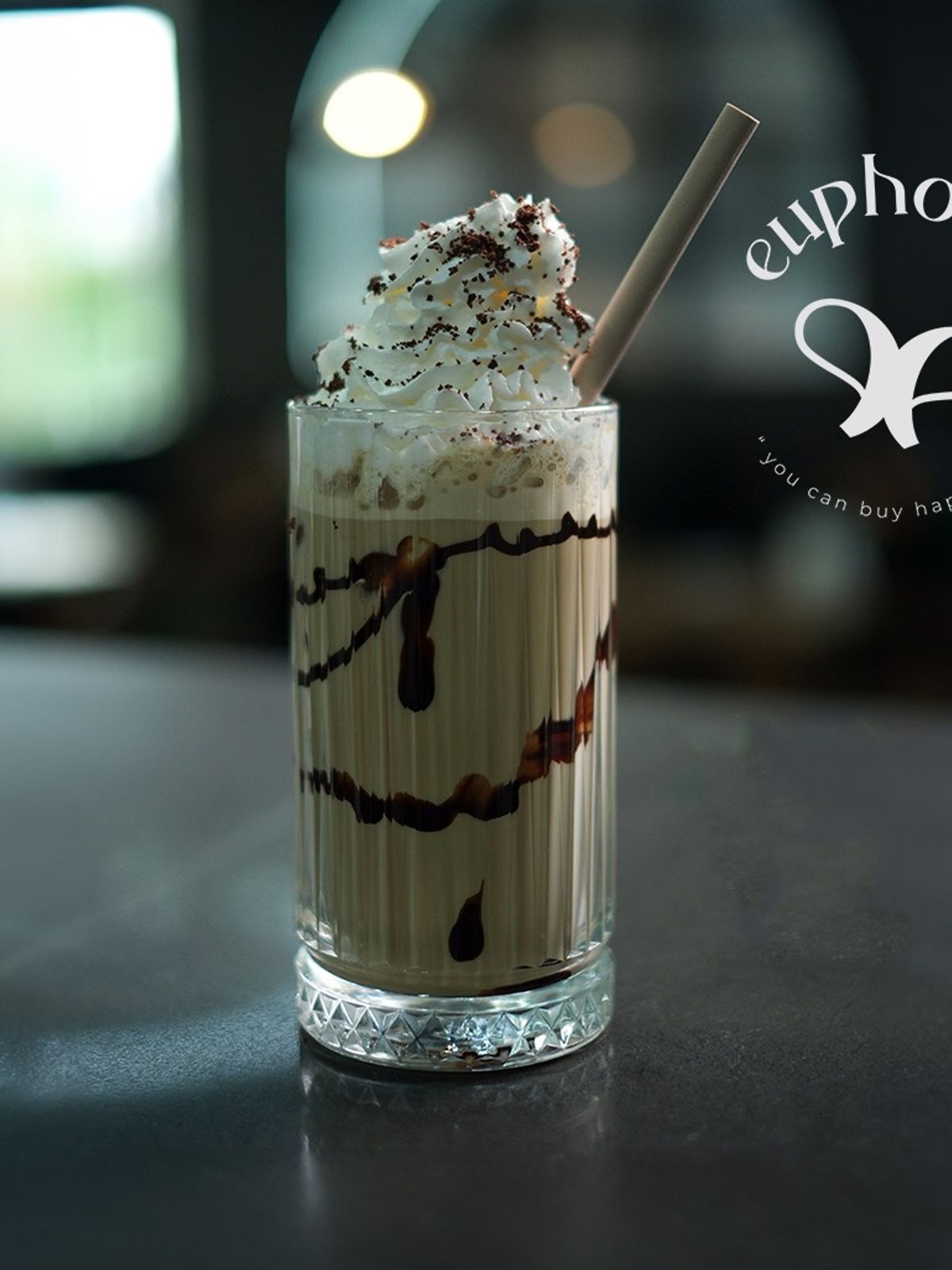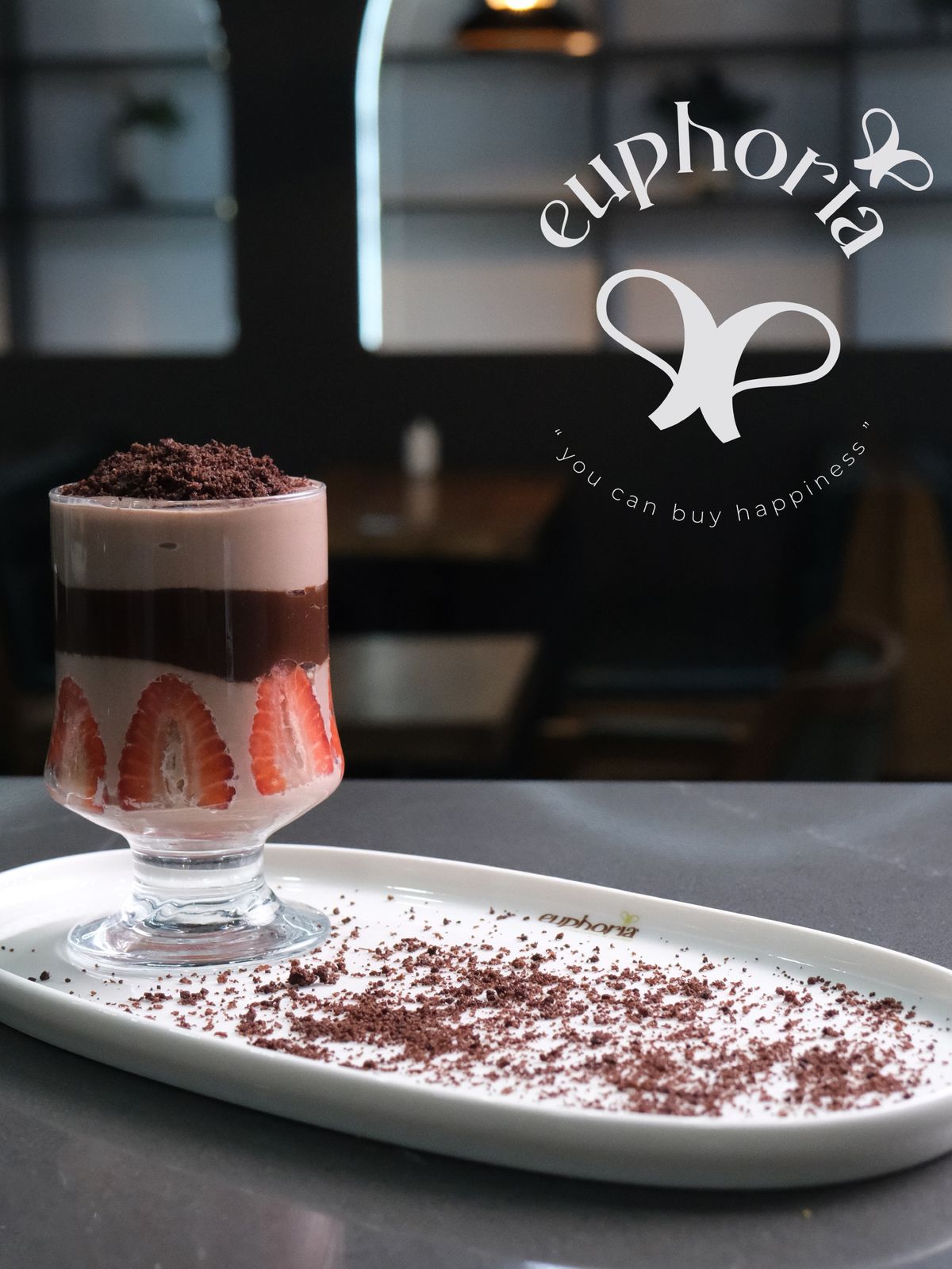 Euphoria bisküvisi, çilek, Euphoria özel soslu krema, kakaolu kek, özel çikolata sos