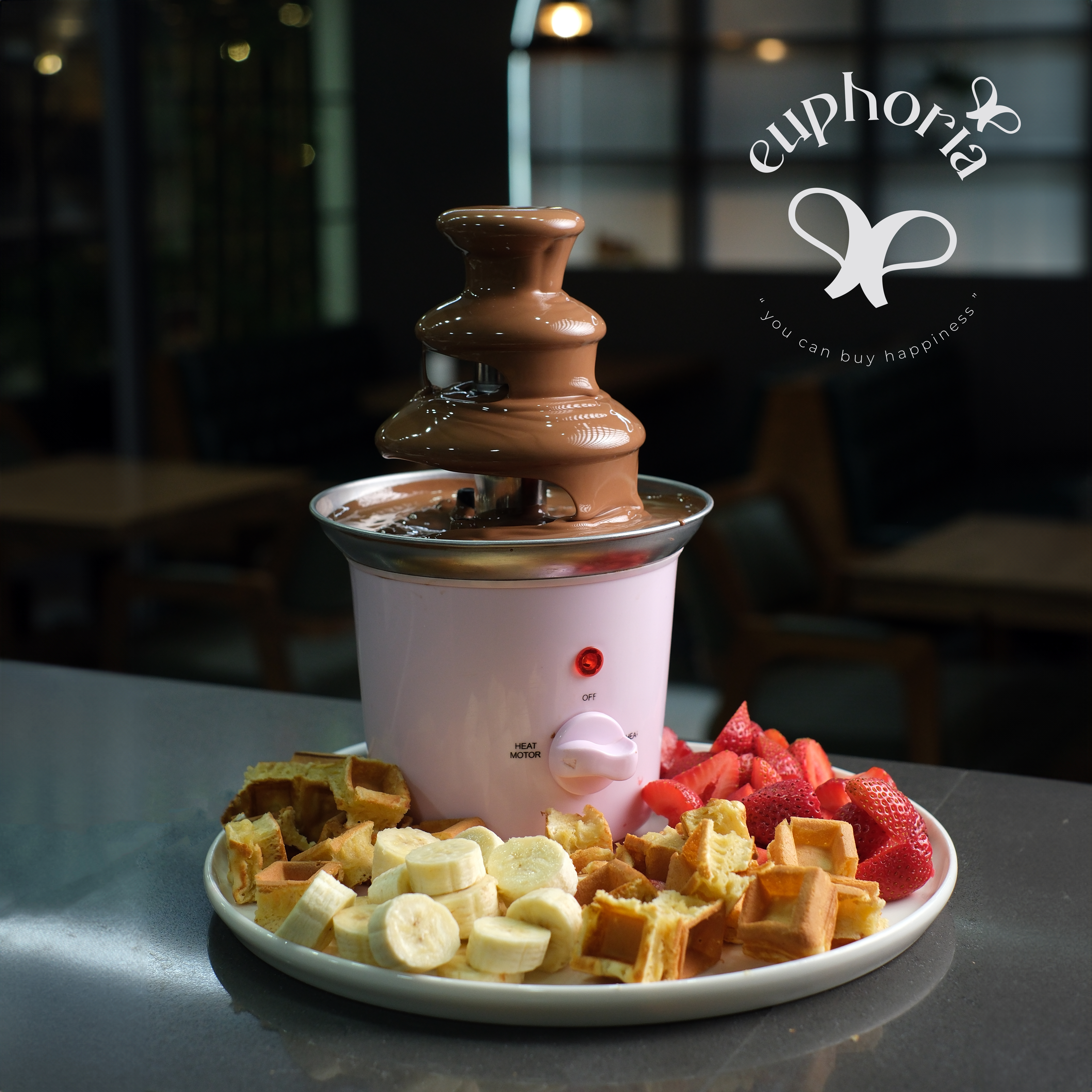 Euphoria waffle parçaları, creme patisserie, mevsim meyveleri, sütlü Belçika çikolatası, fildişi Belçika çikolatası, fındık parçaları
